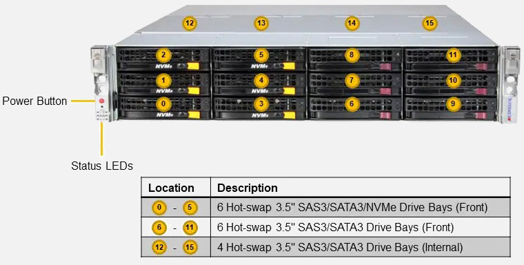 The Supermicro Storage SuperServer 621E-ACR16L | SSG-621E-ACR16L features hot-swap hard drives, giving you more flexibility and allowing you to remove drives without having to shut down the system.