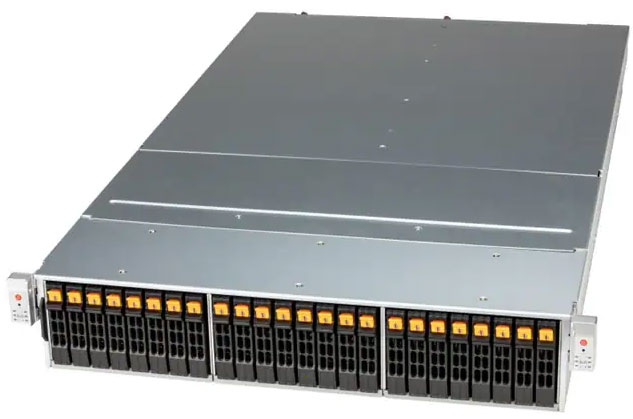 Dual Node, Single Intel 4th Gen Xeon Scalable Processor. 2x PCIe Gen5 x16 HHHL slot & 2x PCIe Gen5 x8 HHHL Slot. Redundant 2000W Power Supply, 24x 2.5" NVMe hot-swappable drive bays.