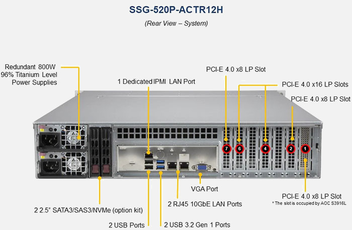 The Supermicro UP Storage SuperServer SSG-520P-ACTR12H | SSG-520P-ACTR12H boasts 4 PCI-Express slots for expandability, and as with all of our servers it can be fully customised online