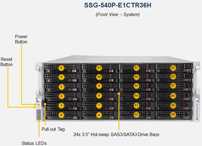 The Supermicro UP Storage SuperServer SSG-540P-E1CTR36H | SSG-540P-E1CTR36H features hot-swap hard drives, giving you more flexibility and allowing you to remove drives without having to shut down the system.
