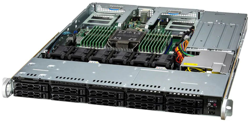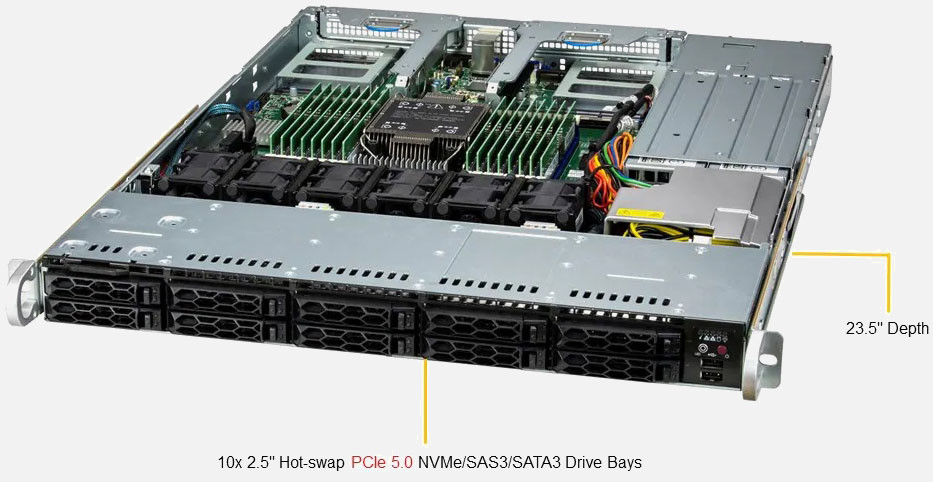 Ideal for virtualisation, cloud computing, enterprise server. 2x PCI-E 5.0 x16 slots. Redundant 800W/860W power supply, 10x 2.5" NVMe/SATA drives