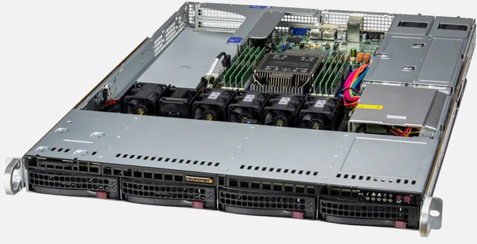 Supports 1x double slot GPU card, 5th/4th Gen Intel Xeon Scalable processor, dual 1Gb/s LAN ports, redundant power supply, 4x 3.5" NVMe/SATA hot-swappable bays