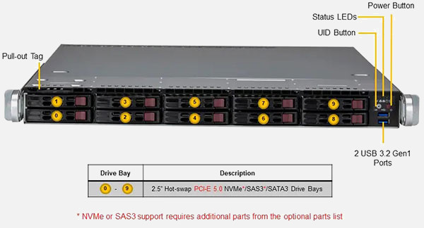 Supports 1x double slot GPU card, 5th/4th Gen Intel Xeon Scalable processor, dual 1Gb/s LAN ports, redundant power supply, 10x 2.5" NVMe/SATA hot-swappable bays