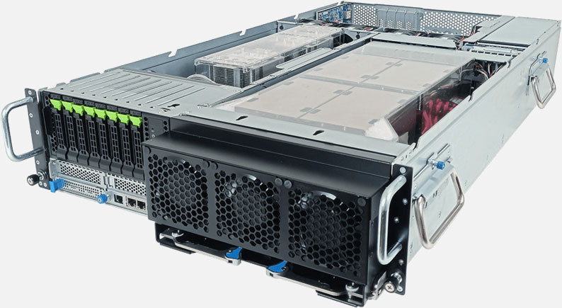 Supports 4x SXM5 GPU Modules, dual 10Gb/s BASE-T LAN ports, redundant power supply, 8x 2.5" NVMe/SATA hot-swappable bays. Built for AI & HPC
