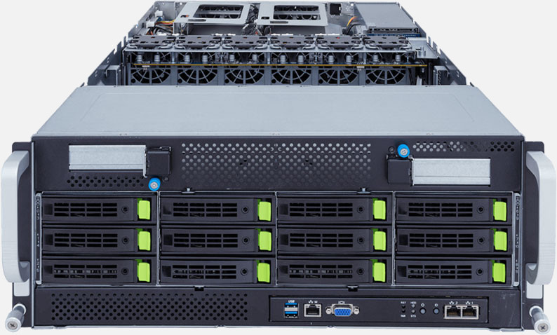 Supports 10x double slot GPU cards, dual 10Gb/s BASE-T LAN ports, redundant power supply, 12x 3.5/2.5" NVMe/SATA hot-swappable bays. Built for AI & HPC